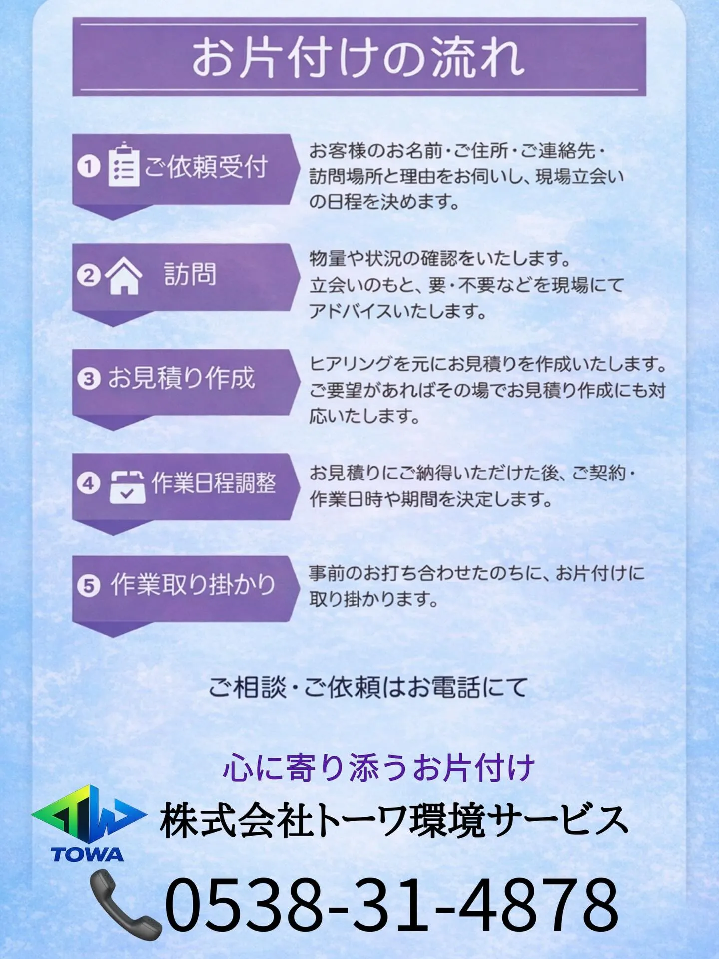 不用品回収や遺品整理を中心に様々なサービスを提供する会社を経営しております。これからを生きる子ども達が安心して暮らせる明るい未来の実現のために、リサイクル・リユースの拡大を意識した取り組みに力を入れています。個人宅だけではなく、オフィスや店舗などの大量の不用品にも対応いたします。